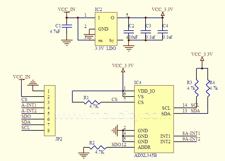 The ADXL345 is a small, thin, ultralow power, 3-axis accelerometer with high resolution (13-bit) measurement at up to ±16 g. Digital output data is formatted as 16-bit twos complement and is acces-sible through either a SPI (3- or 4-wire) or I2C digital interface.