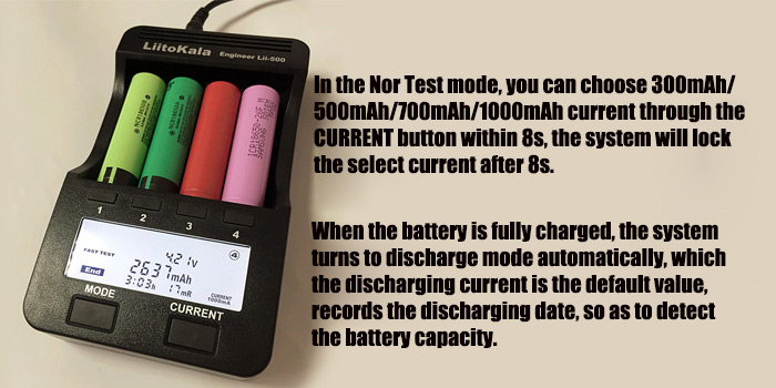 Note that this product capacity test mode, the discharge mode is divided into two kinds, when you select the charge current (300mA, 500mA), the system automatically default discharge current of 250mA, when you select the charge current (700mA, 1000mA) , the system automatically default discharge current of 500mA,