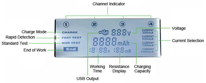 1. The charger has six buttons, mode selection key (MODE), the current selection key (CURREN), and view the data independently selected key (1234), the use of simple and convenient;
