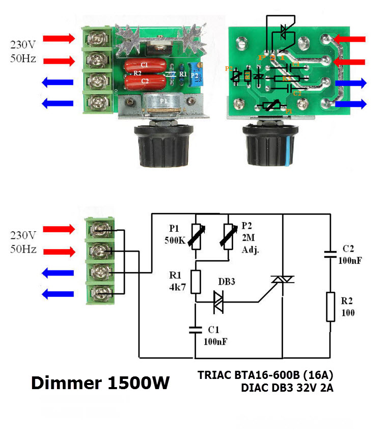 ในรูปที่ 23 แสดงถึงวงจรที่ใช้ไดแอกเป็นตัวสร้างสัญญาณกระตุ้นให้แก่ไตรแอก ผลที่เกิดขึ้นสำหรับวงจรนี้คือการควบคุมความสว่างของหลอดไฟจะไม่สมบูรณ์เนื่องฮิสเทอรีซิส หรือเรียกว่าแบคแลช (backlash) นั่นคือ ในขณะที่ทำการลดความสว่างของหลอดไฟจนกระทั่งดับ โดยการปรับค่า VR1 ให้สูงสุดนั้น ถ้าต้องการให้หลอดไฟเริ่มสว่างอีกครั้ง จะต้องปรับ VR1 ไปเป็นค่าประมาณ 80 เปอร์เซ็นต์ ของค่าสูงสุด ความสว่างที่ได้จะไม่ใช่ค่อย ๆ เริ่มสว่าง แต่จะสว่างขึ้นเล็กน้อยอย่างทันทีทันใด จึงเป็นการทำให้ควบคุมความสว่างได้ไม่ต่อเนื่องเท่าที่ควร ซึ่งเกิดขึ้นเนื่องจากในขณะที่ไดแอกกระตุ้นไตรแอกนั้นจะเป็นการคายประจุของ C1 ออกไปด้วย