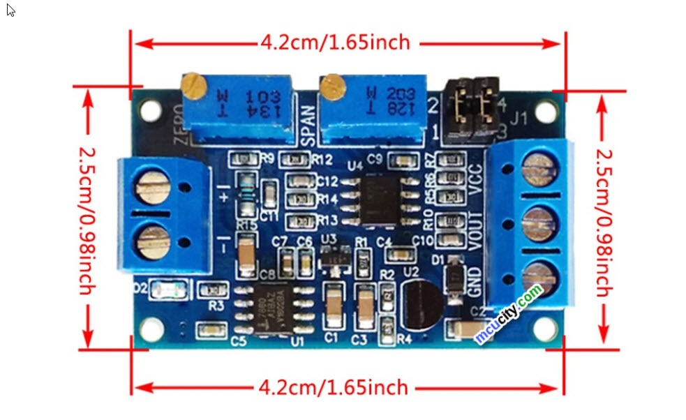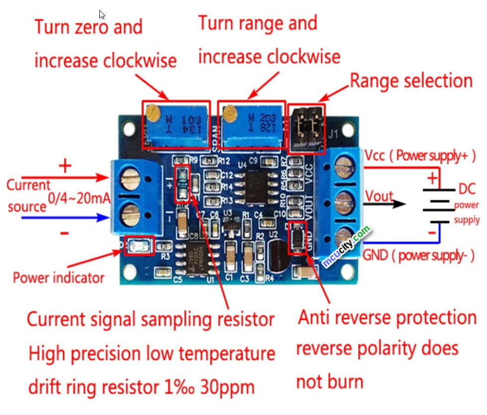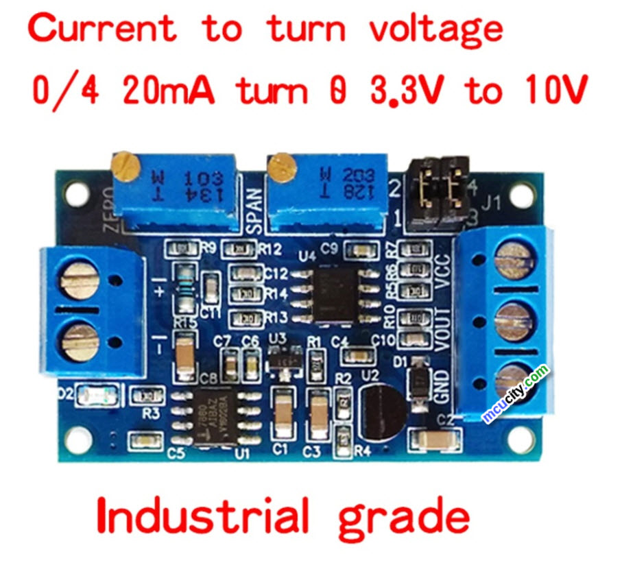 In the process of circuit signal transmission, the voltage signal will increase with the transmission distance becomes weak, the use of current transmission can avoid the signal weakening. This module is used for the end of the current signal transmission, the signal into a voltage signal for single-chip detection. Current input support 4-20Ma, 0-20mA, voltage output support 0-3.3V, 0-5V , 0-10V