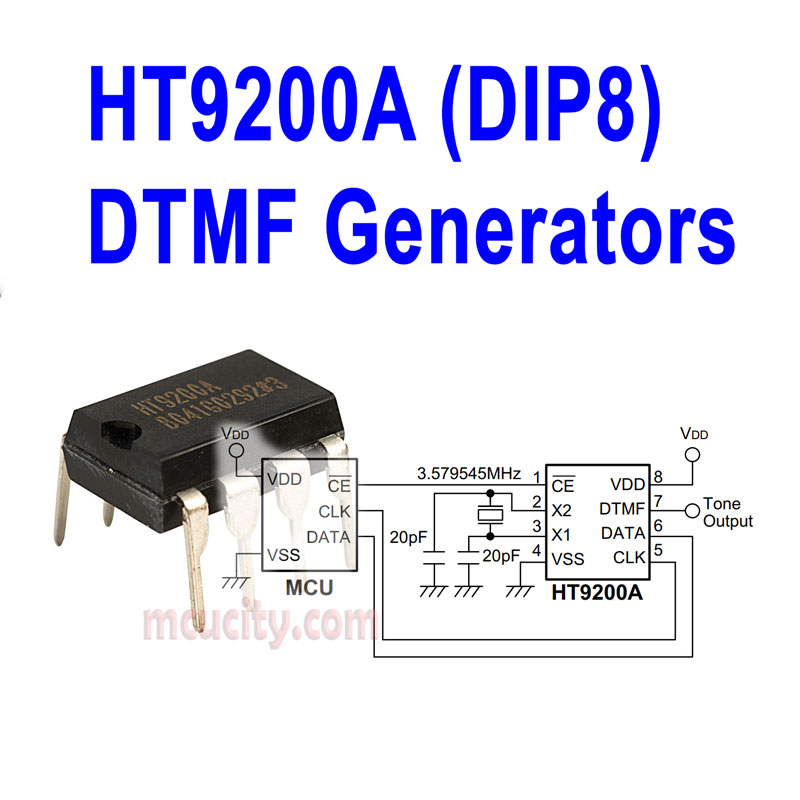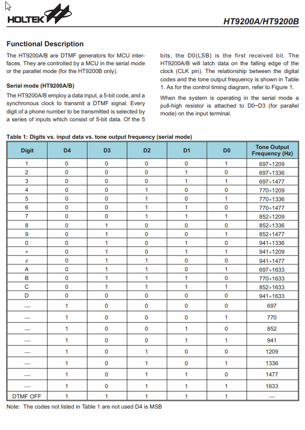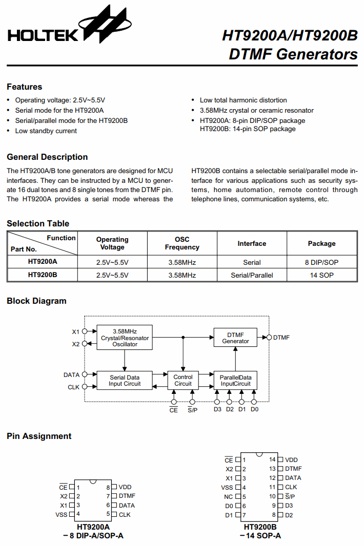 The HT9200A/B tone generators are designed for MCU interfaces. They can be instructed by a MCU to generate 16 dual tones and 8 single tones from the DTMF pin. The HT9200A provides a serial mode whereas the HT9200B contains a selectable serial/parallel mode interface for various applications such as security systems, home automation, remote control through telephone lines, communication systems, etc.
