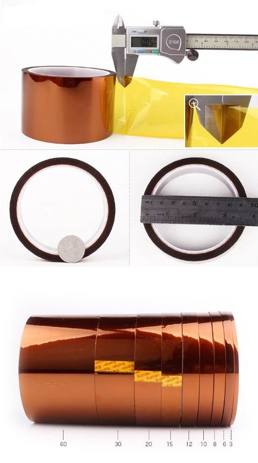 High Temperature Kapton Polyimide Tape with one sided silicone adhesive in a range of sizes suitable for 3D Printing applications and electrical insulation up to 280ºC.