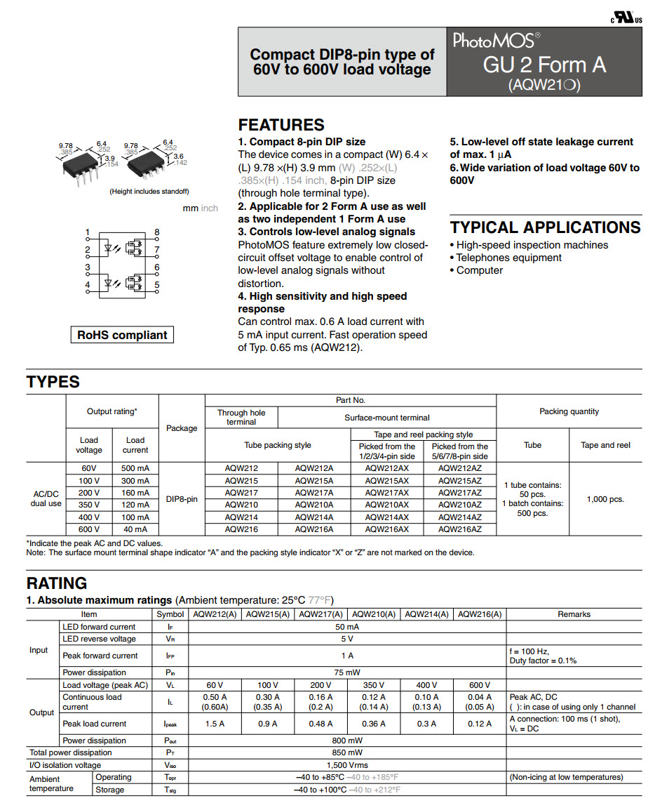 1. Compact 8-pin DIP size The device comes in a compact (W) 6.4 × (L) 9.78 ×(H) 3.9 mm (W) .252×(L) .385×(H) .154 inch, 8-pin DIP size (through hole terminal type).